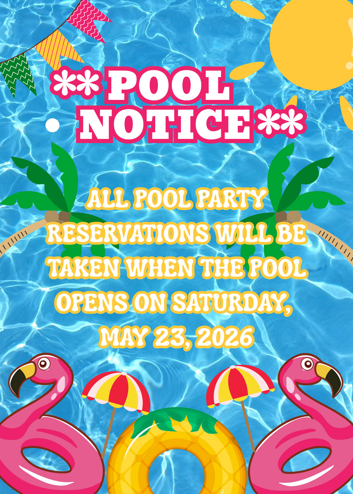ALL POOL PARTY RESERVATIONS WILL BE TAKEN WHEN THE POOL OPENS ON SATURDAY, MAY 23, 2026